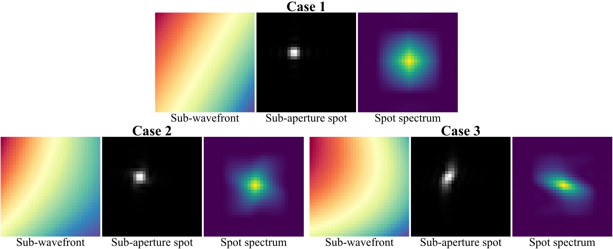 Figure 2 Sub-wavefronts, sub-aperture spot images, and corresponding spot spectra under three conditions