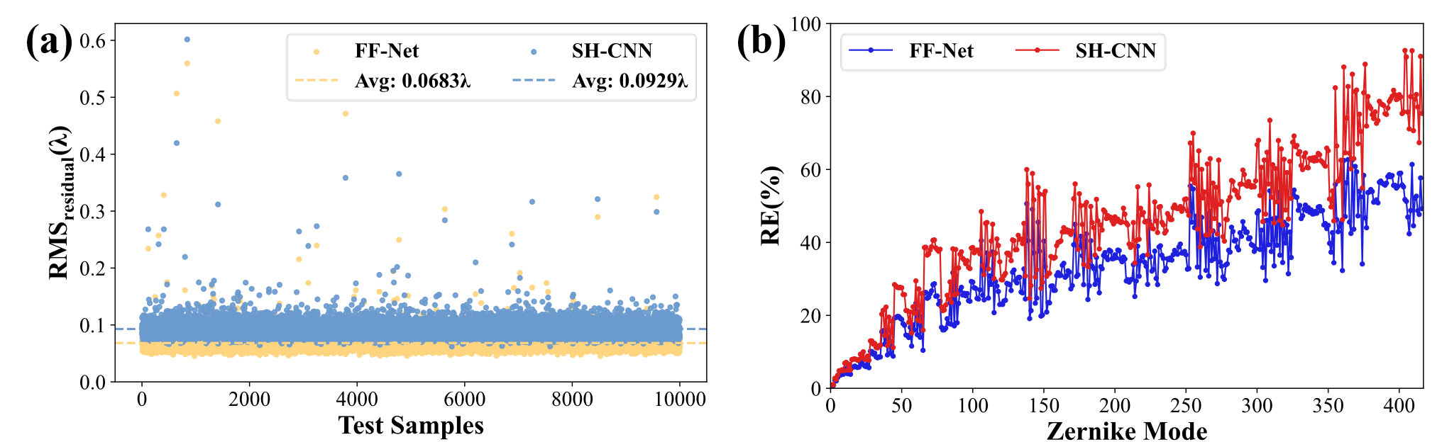 Figure 3 Comparison of super-resolution wavefront reconstruction performance between FF-Net and SH-CNN on the test dataset. (a) Scatter plot of root-mean-square (RMS) values for residual wavefronts; (b) Line chart of relative errors in single-mode reconstruction.