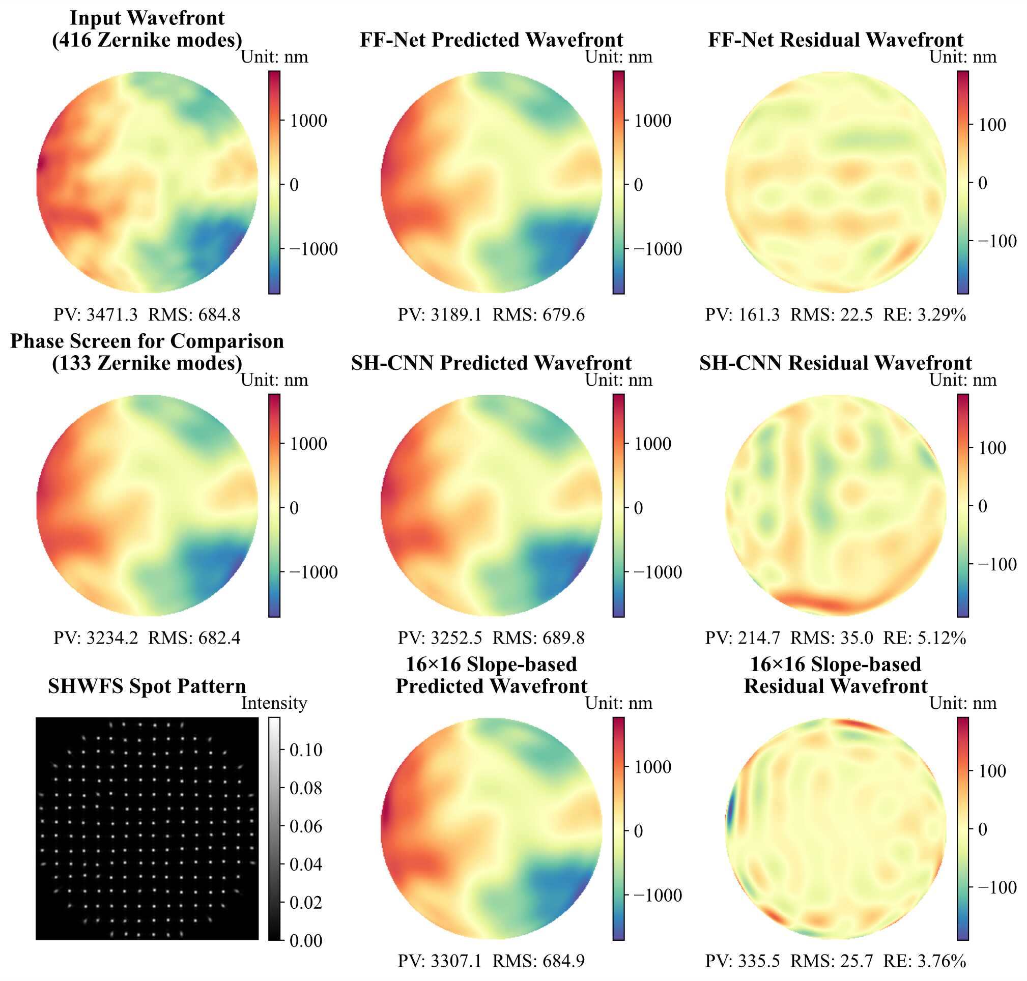 Figure 4 Comparison of wavefront reconstruction results among FF-Net, SH-CNN and slope-based method: Reconstruction of 133 Zernike modes (Deep learning methods employed 8×8 microlens arrays, while the slope-based method used 16×16 microlens arrays)
